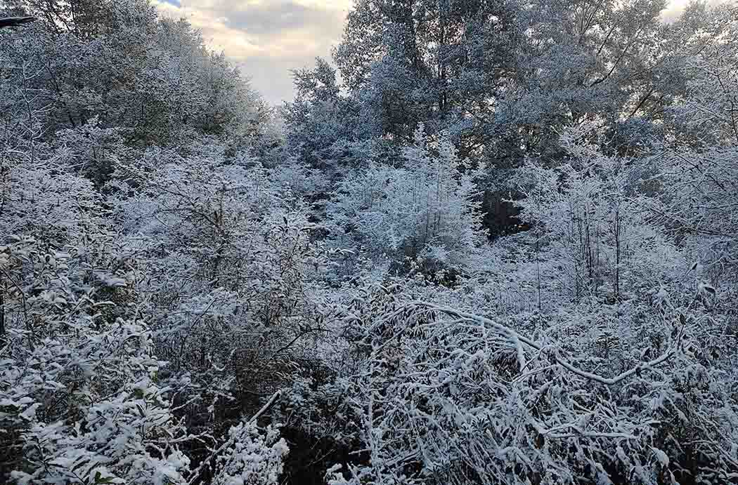 Rain turned to snow sometime after 4 a.m. driven by a northeasterly wind. Wet snow clung to everything except for roadways and bare ground.