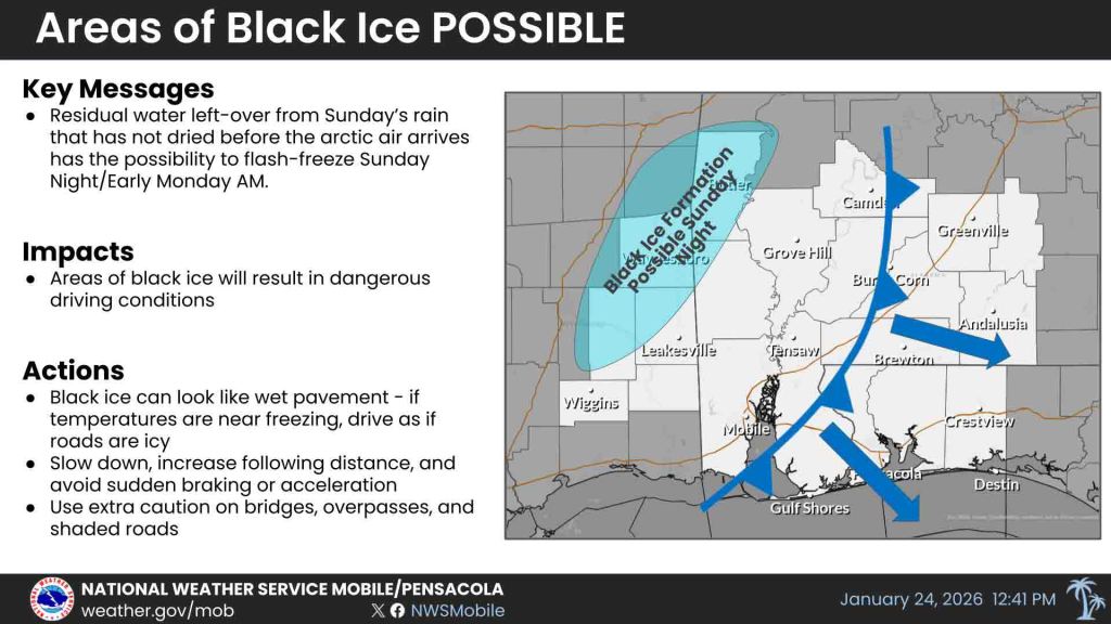 Depending on how much it rains tomorrow and how quickly temperatures drop, some black ice could form on bridges and overpasses in southeastern Mississippi and interior southwest Alabama. It will be a race for roads to dry before temperatures plummet to freezing and below, according to the NWS.