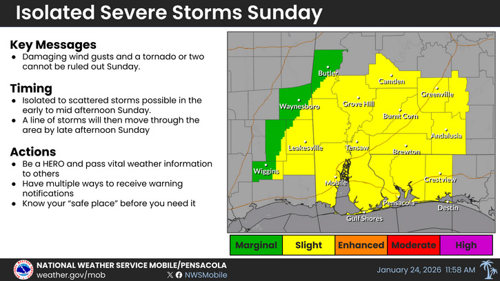 HOLT, Fla., Jan. 24, 2026—The risk of severe weather tomorrow for the northwest Florida panhandle has been elevated to a level 2 out of 5 as a cold front moves through the area.