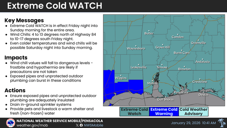 HOLT, Fla., Jan. 29, 2026—An extreme cold watch will be in effect beginning Saturday at midnight until noon Sunday due to an arctic air mass that will bring dangerously cold temperatures and wind chills Saturday into Sunday.