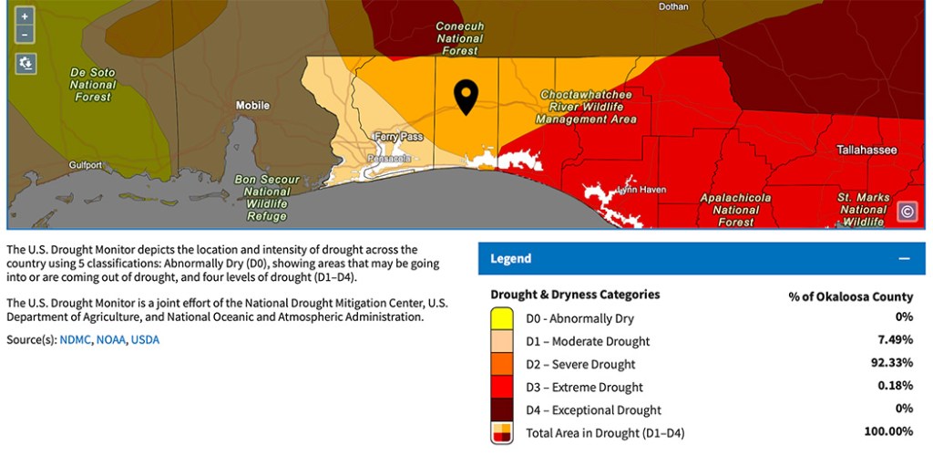 The U.S. Drought Monitor indicates that most of Okaloosa County is in a severe drought while the entire forecast area has registered below-average rainfall.