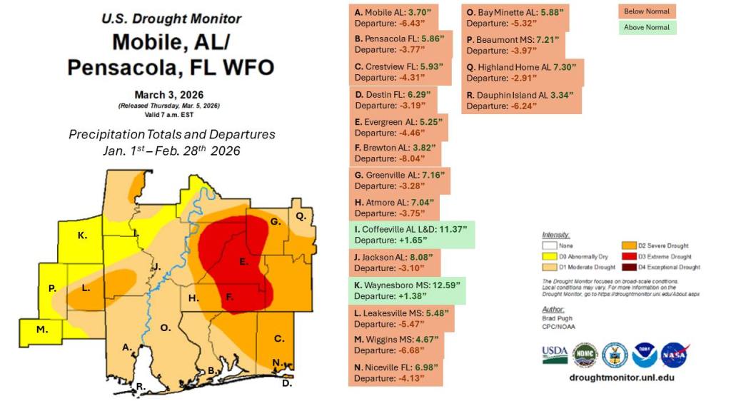 MOBILE, Fla., March 6, 2026—Drought conditions are worsening through the central Gulf Coast.