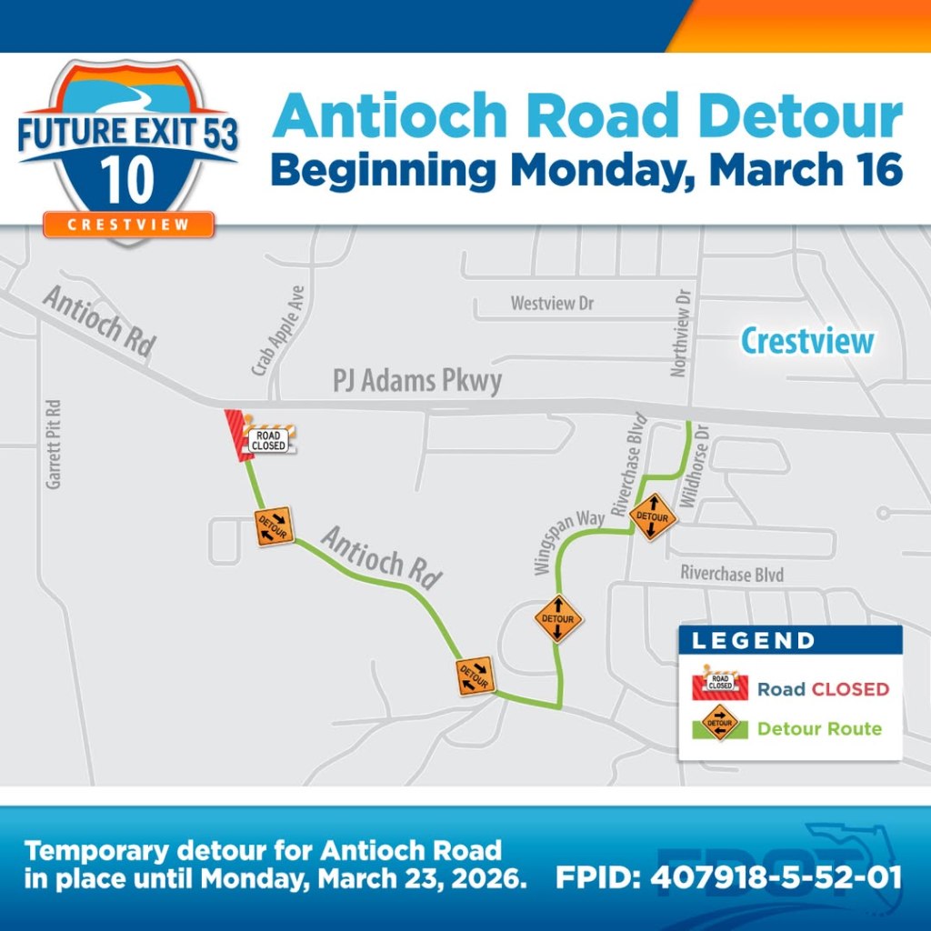 CRESTVIEW, Fla., March 11, 2026—Antioch Road will be temporarily closed beginning March 16-23.